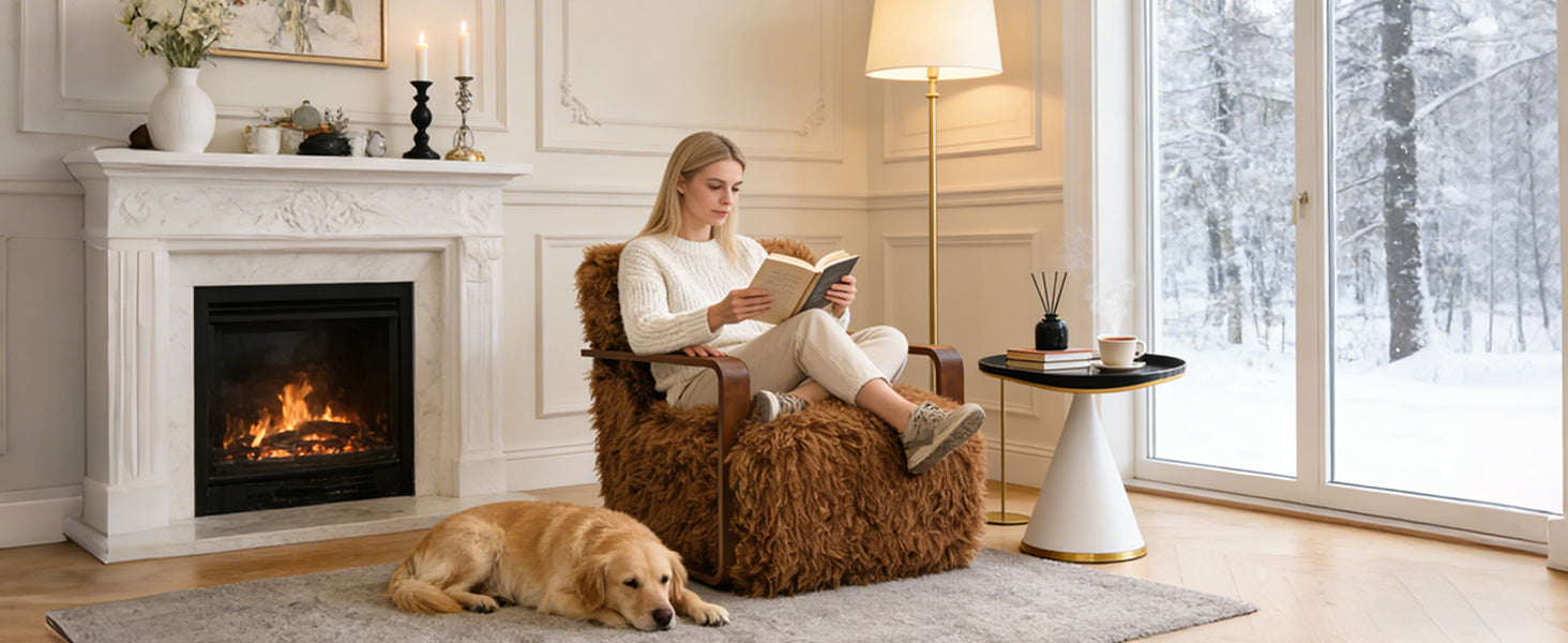 Ultra Soft Faux Fur Accent Chair – Retro Curves, Dark Walnut Wood Arms