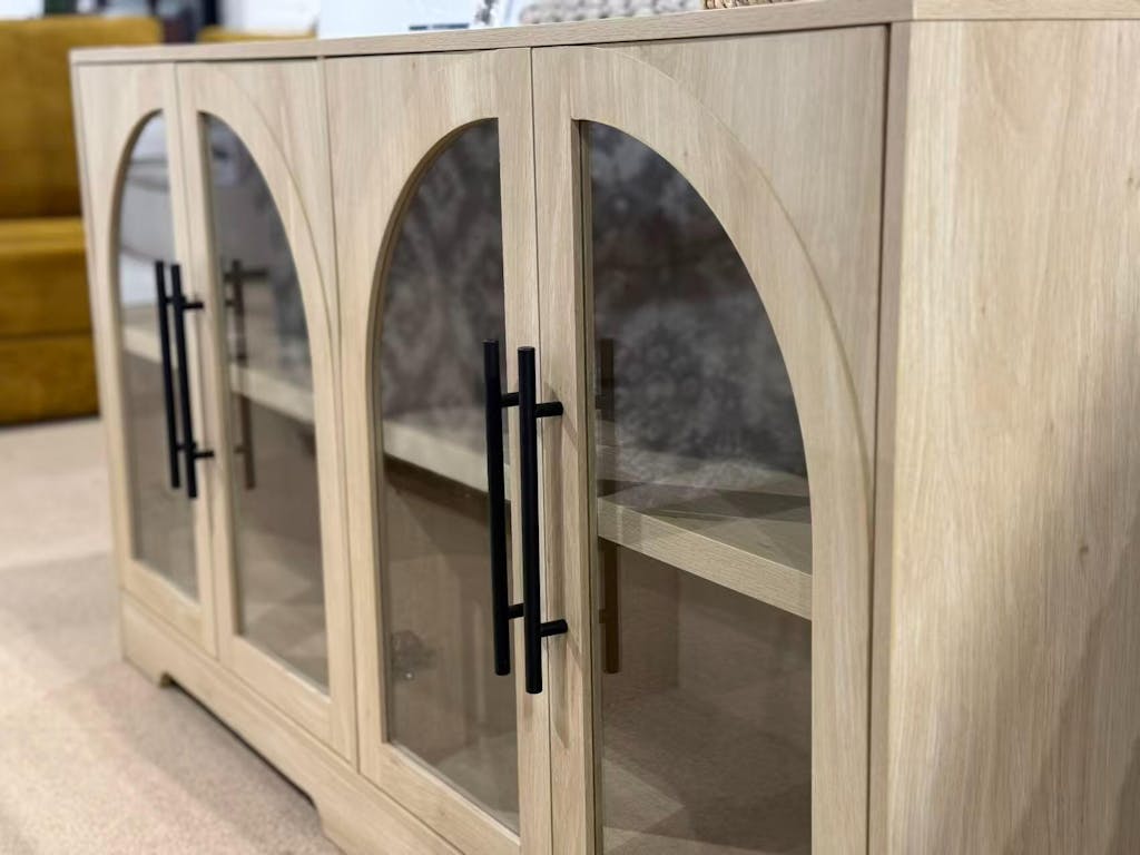 Clean-lined silhouette with arched glass panel detailing blends rustic warmth with contemporary simplicity.