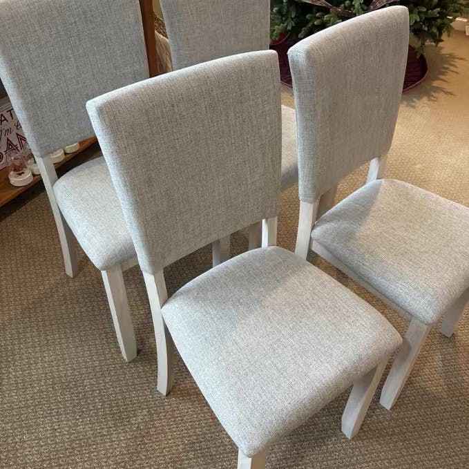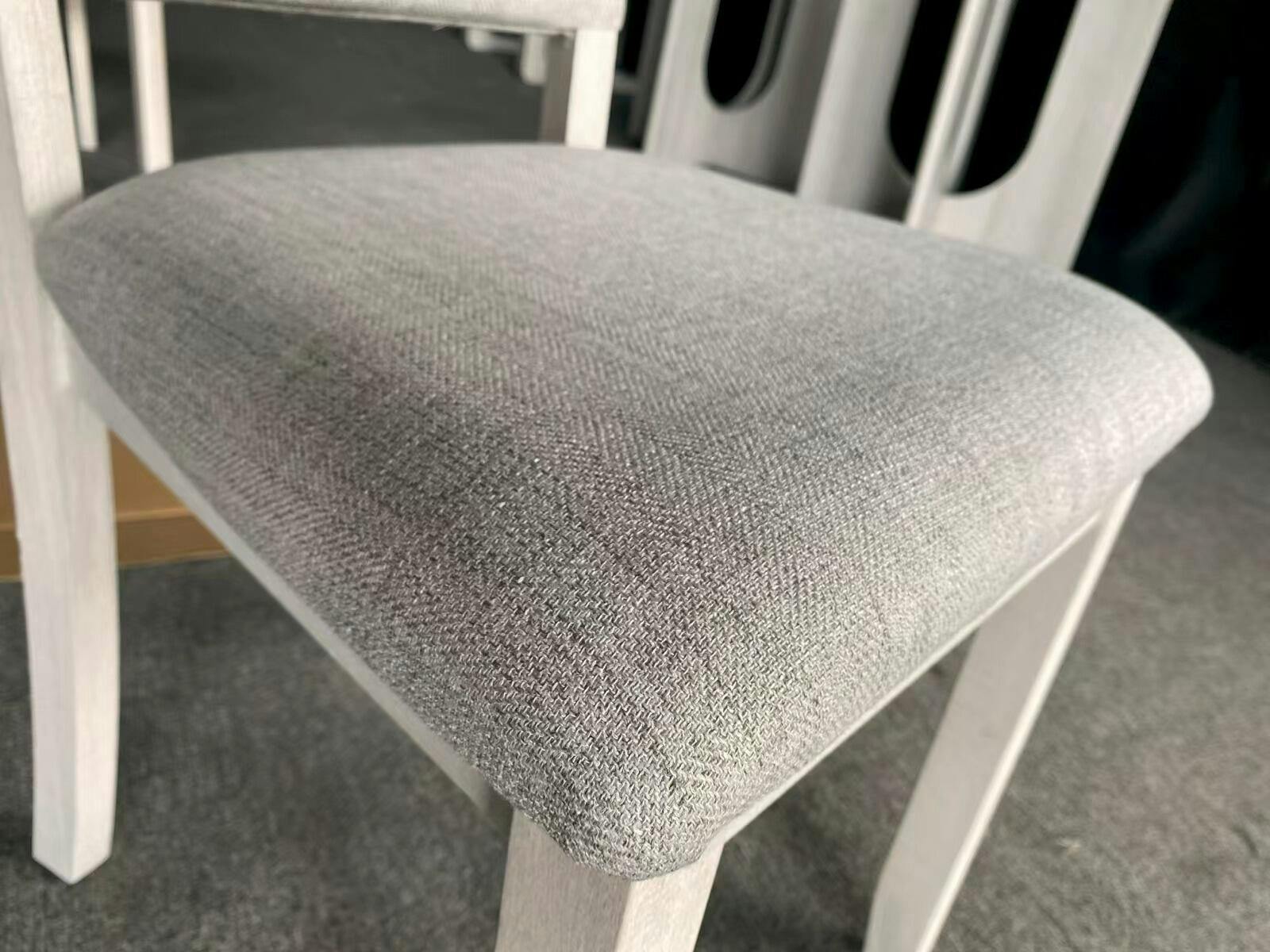 - Crafted with a sturdy combination of rubberwood and engineered wood for strength and everyday durability. Upholstered chairs feature padded seats with supportive foam cushioning, wrapped in soft, easy-care fabric for comfortable dining.